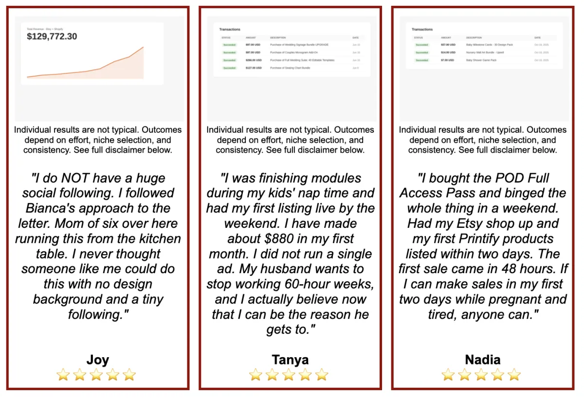 Every person's situation is different. Results depend on individual effort, niche selection, product strategy, consistency, and execution. No specific income levels, sales figures, or outcomes are guaranteed.